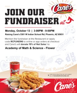 ???? Just mention our fundraiser at the restaurant OR use the code when ordering online, and Cane’s will donate 15% of sales back to our school! ????